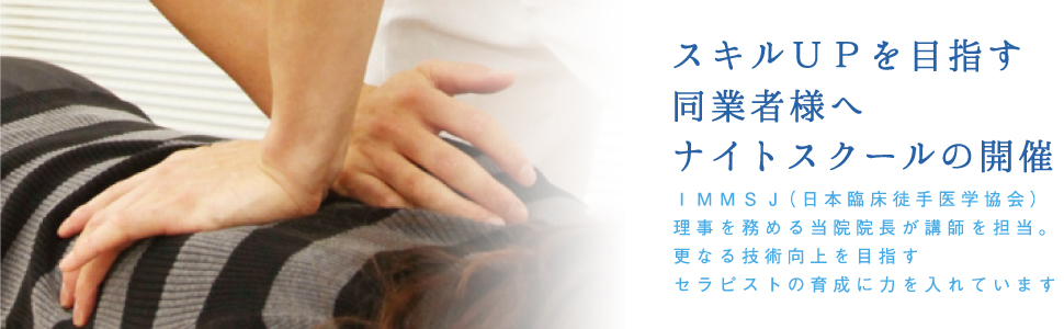 当院のコンセプトは、『脊柱骨盤の正中化と再発予防』です。骨盤の歪んだ原因をテストによって判別し、硬い関節なら動きを出し、ルーズ(不安定)な関節にはインナーマッスルトレーニングにより骨盤帯安定化運動を行います。治療後は在宅トレーニングを指導し、再発予防に努めています。