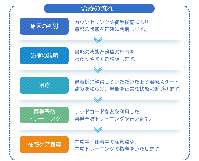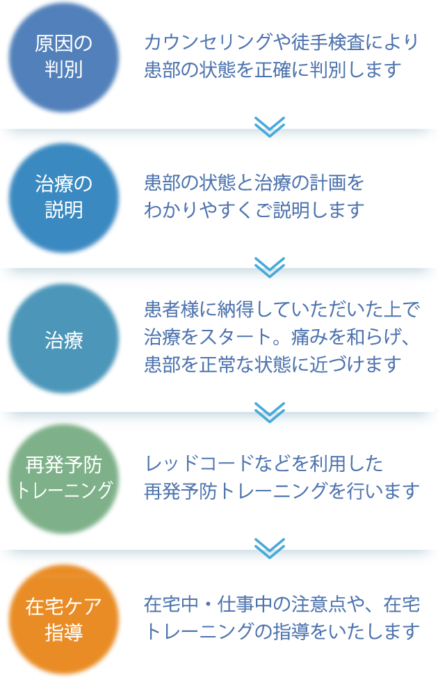 - カウンセリングや徒手検査により、幹部の状態を正確に判別します
