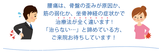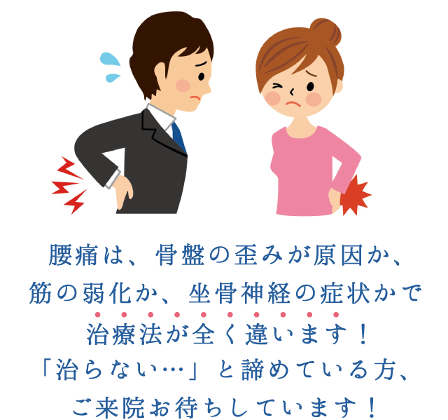 当院のコンセプトは、『脊柱骨盤の正中化と再発予防』です。骨盤の歪んだ原因をテストによって判別し、硬い関節なら動きを出し、ルーズ(不安定)な関節にはインナーマッスルトレーニングにより骨盤帯安定化運動を行います。治療後は在宅トレーニングを指導し、再発予防に努めています。