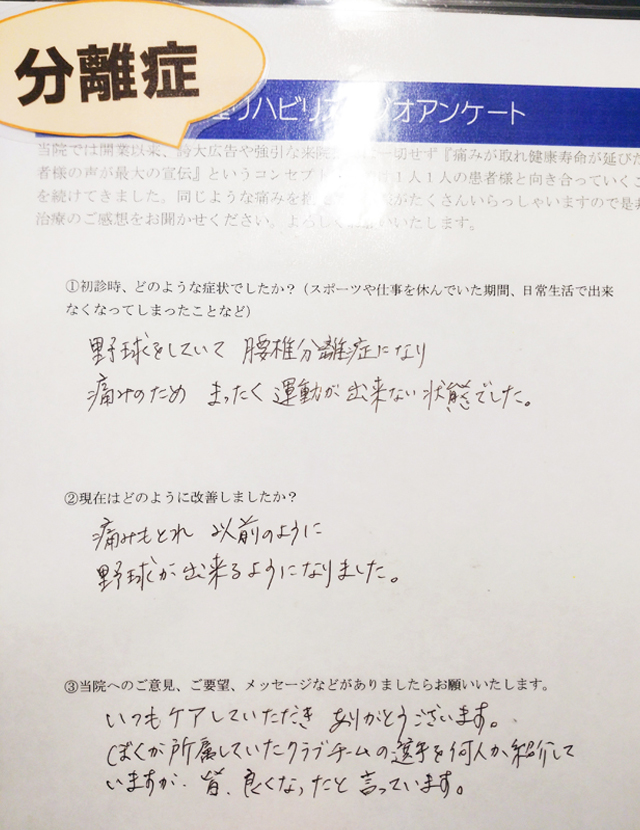 野球をしていて腰椎分離症になり、痛みのためまったく運動が出来ない状態でした。